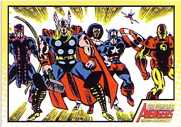 Comments: This set celebrates all the various versions of the Avengers teams and team members. Each card duplicates comic artwork panels from the original comic issues, so the basic set does not contain original artwork, but does highlight various moments in Avengers history by focusing on particular comic issues. The card backs contain a synopsis of the storyline, along with an image of the Avengers comic cover for that particular issue. Original artwork is seen in the Greatest Enemies and Earth's Mightiest Heroes chase sets, as well as the sketch cards. The Greatest Enemies chase cards are comprised of three different 3-card tryptich puzzles. The Archive Cut Comic Panel 2-case incentive is an actual 2-piece panel cut from one of the first ten original comic issues. The card measures 8" x 10". All promo cards contain [previously published] comic artwork not seen in the basic set. The 4-card promo sheet was distributed at various comic conventions.