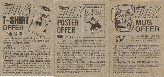 Three variations of card backs (cards #9-#24) from 1978 Incredible Hulk Drakes Cakes.